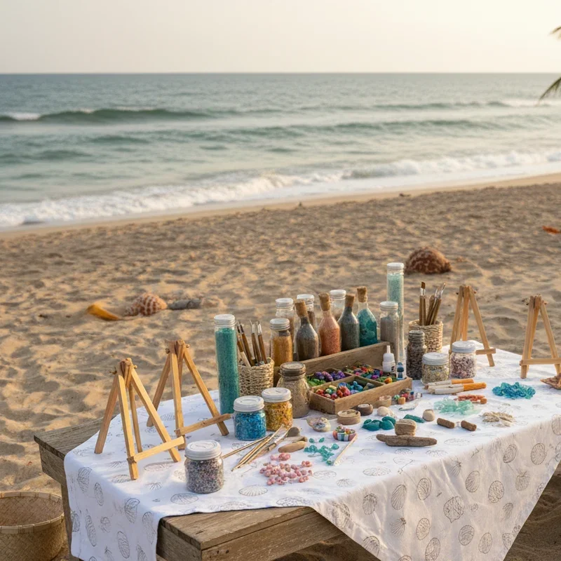 Set up creative stations where guests can make beach-inspired crafts that serve as both party entertainment and personalized souvenirs from your special day. Provide materials for painting seashells, creating wind chimes from driftwood and shells, or designing custom beach bags with fabric markers and stencils. Include a jewelry-making station where guests string shells, sea glass, and beads into necklaces or bracelets they'll actually want to wear. Arrange sand art bottles with colored sand layers, or teach everyone to make beach terrariums in small jars they can take home as party favors. These hands-on activities work especially well for mixed-age groups, giving everyone from kids to grandparents a chance to express creativity while chatting and enjoying the ocean breeze together.