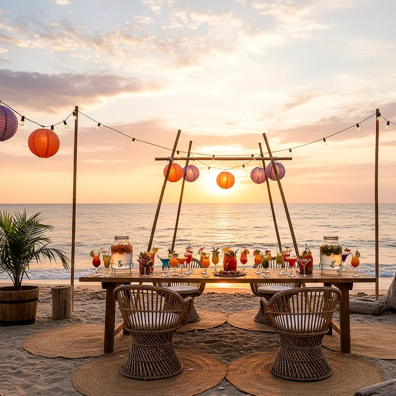 Transform your beach spot into a Hawaiian paradise where grass skirts sway and coconut drinks flow freely, creating an island escape your guests won't forget. String up colorful paper lanterns between palm trees, scatter hibiscus flowers on picnic tables, and greet everyone with fresh flower leis that instantly transport them to the tropics. Set up a tiki bar serving fruity mocktails in hollowed pineapples, complete with those tiny umbrellas that make every drink feel special. Organize hula hoop contests, limbo competitions, and teach everyone basic hula dance moves that'll have them laughing and moving to ukulele tunes. The beauty of a luau theme lies in its flexibility; you can go all out with roasted pig and poi or keep it simple with grilled pineapple and coconut shrimp that captures those island flavors perfectly.