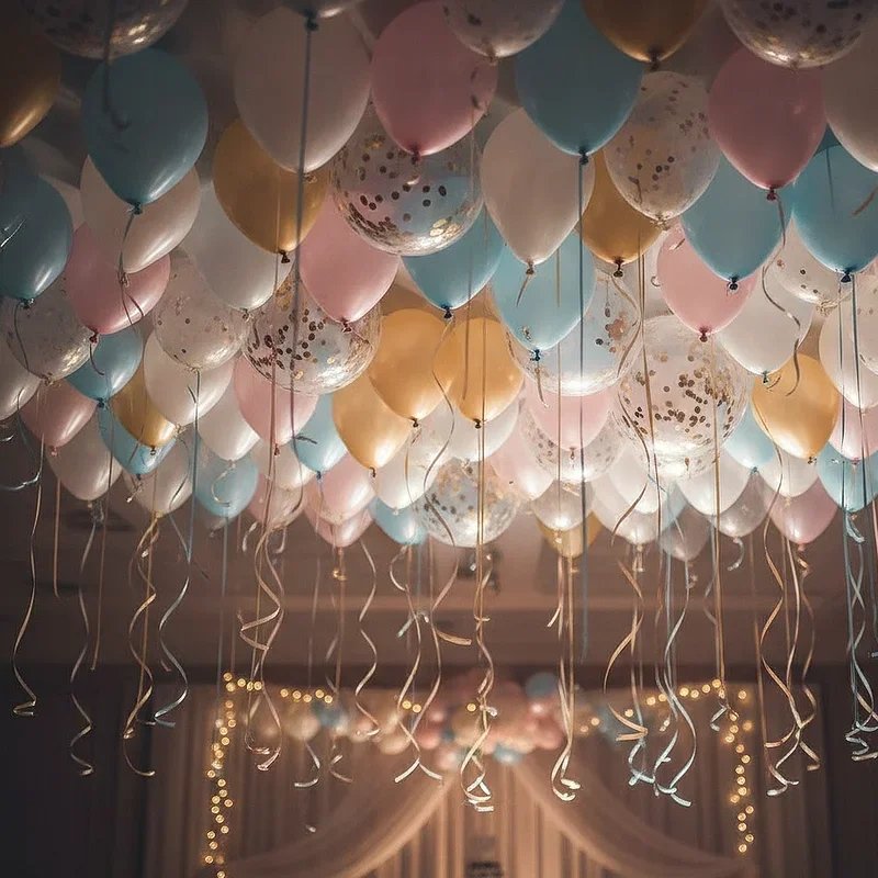 Creating a balloon ceiling turns your party space into a magical floating wonderland that guests won't forget. Start by inflating balloons with helium and attach ribbons of varying lengths to create depth and movement across your ceiling. Mix metallic balloons with solid colors and add some clear balloons filled with confetti for extra sparkle. The trick lies in clustering them strategically rather than spreading them evenly, which creates visual interest and natural gathering spots. This decoration works brilliantly for surprise parties since guests look up in awe when they enter. Consider adding LED lights inside some balloons for an evening party to create a dreamy glow that photographs beautifully.