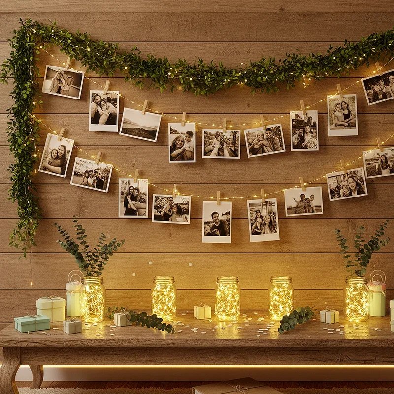 Create a nostalgic journey through the birthday person's life with a thoughtfully curated photo display that sparks conversations and memories. String photos chronologically along wire with mini clothespins, or create a photo tree using branches in a tall vase. Mix black and white photos with color ones for visual variety, and include pictures with different guests to make everyone feel connected. Add captions with dates or funny memories to give context and encourage storytelling among guests. This personal decoration becomes an interactive element as people gather to point out their appearances and share stories. Position it in a high-traffic area where guests naturally congregate, turning memories into a living decoration.