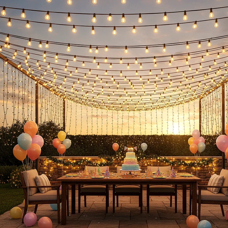 Create an enchanting atmosphere by draping string lights across your ceiling to form a twinkling canopy above your guests. Start from a central point and extend lights outward like spokes of a wheel, or create parallel lines for a more structured look. Warm white lights offer classic elegance while multicolored options bring playful energy to children's parties. Layer different types of string lights such as fairy lights with larger bulb strings for depth and texture. This lighting solution works indoors and outdoors, instantly elevating any space from ordinary to extraordinary. The soft glow creates perfect ambient lighting for evening celebrations and makes everyone look their best in photos.
