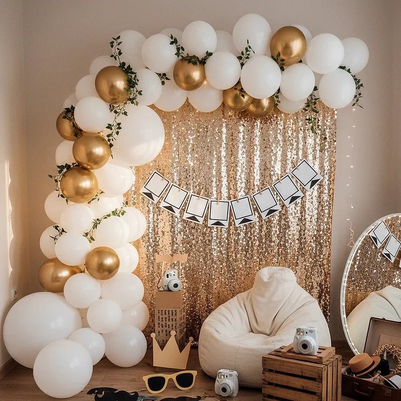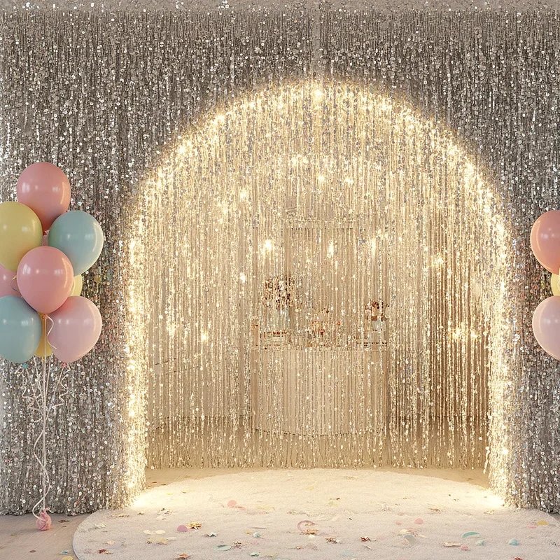 Set the tone from the moment guests arrive by creating a glamorous entrance with cascading glitter or tinsel curtains. This simple yet effective decoration immediately signals that something special awaits inside. Choose from metallic options like gold, silver, or rose gold, or go bold with rainbow colors for a fun celebration. The curtains catch and reflect light beautifully, creating a dynamic shimmer as people pass through. They work equally well as room dividers, photo backdrops, or behind the main party table. The tactile experience of walking through the curtains adds an element of surprise and delight that guests of all ages enjoy while creating perfect social media moments.