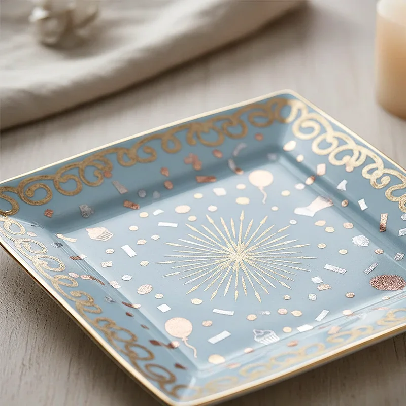 Add instant glamour to your birthday celebration with plates featuring metallic foil accents that catch and reflect light like tiny mirrors across your table. These show-stopping pieces come in various styles, from subtle metallic rims to bold splattered designs that look like abstract art. Rose gold, copper, silver, and gold options mean you can match any party theme or color palette while adding that special sparkle that says "celebration." You'll love how these plates photograph beautifully, creating stunning images that capture the festive atmosphere of your special day. The metallic elements also tie in perfectly with other party decorations like balloons, streamers, and confetti, creating a cohesive look that feels intentionally designed rather than thrown together.