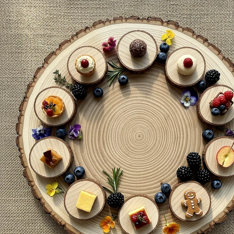 Bring the warmth of nature to your birthday celebration with rustic wooden rounds that serve as both plates and decorative elements. These natural pieces, often cut from tree trunks and finished to food-safe standards, create an organic, earthy atmosphere perfect for outdoor parties or farmhouse-themed celebrations. Each wooden round features unique grain patterns and natural edges, making every place setting slightly different and special. You're creating a connection to nature that grounds your celebration and makes guests feel relaxed and welcomed. These versatile pieces work beautifully for everything from appetizer service to dessert presentation, and they pair wonderfully with mason jars, burlap runners, and wildflower centerpieces.