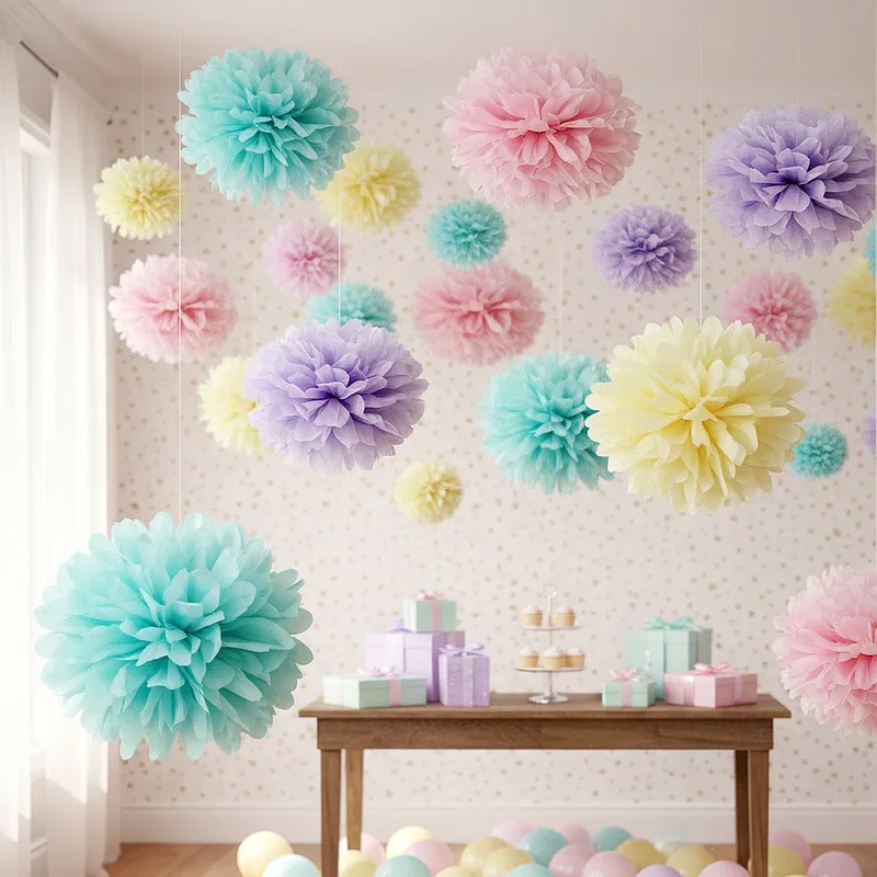 Tissue paper pom poms offer an affordable way to add volume and color to your birthday room decorations. Create pom poms in various sizes using different colored tissue paper, then group them in clusters for maximum impact. Hang them from the ceiling at different heights to create a floating garden effect above your party space. These fluffy decorations work beautifully when combined with streamers or ribbons flowing down from each pom pom. You can make them weeks ahead of time and store them flat until party day, then fluff them up for instant decoration. Choose colors that match your theme or create an ombre effect by using different shades of the same color. Their lightweight nature makes them perfect for spaces where you can't damage walls or ceilings.