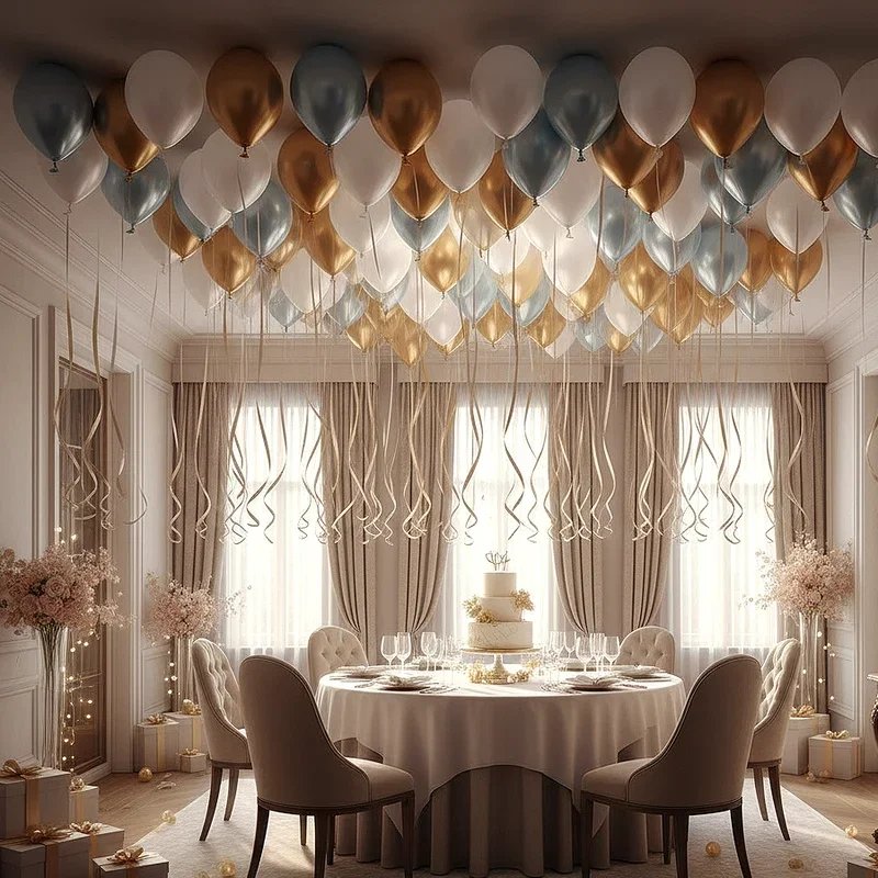 Transform your ceiling into a floating wonderland by creating a balloon ceiling installation that'll leave guests mesmerized. Start by inflating balloons with helium and attach long ribbons that cascade down at varying heights, creating a magical overhead display. Mix different sizes and colors to add depth and visual interest to your design. You can cluster balloons in specific areas or spread them evenly across the entire ceiling for complete coverage. Add some metallic or confetti-filled balloons to catch the light and create sparkle throughout the room. This classic decoration never goes out of style and instantly signals celebration mode. Consider using biodegradable balloons to make your party more eco-friendly while maintaining that festive atmosphere everyone loves.