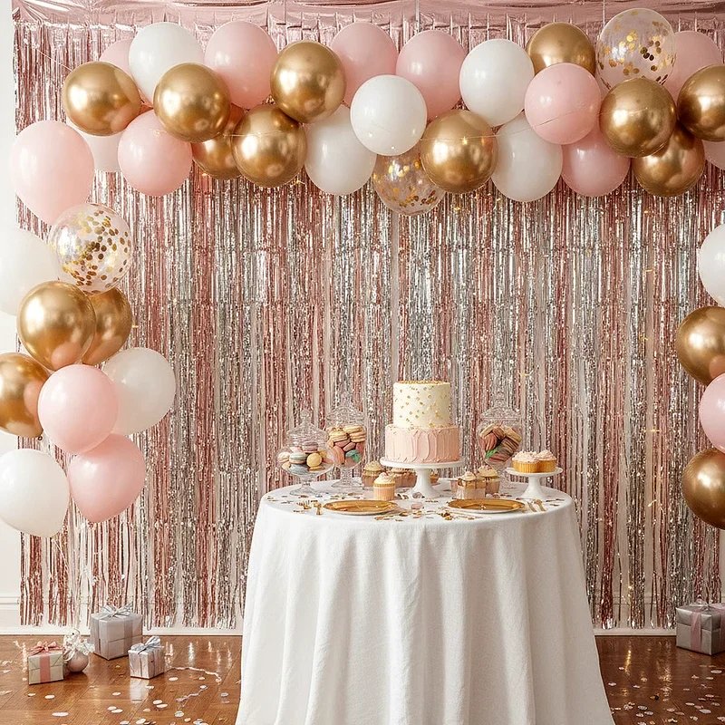 Install shimmering metallic fringe curtains to create an eye-catching backdrop that screams celebration and fun. These curtains reflect light beautifully, adding movement and sparkle every time someone walks by or a breeze flows through. Layer different metallic colors like gold, silver, and rose gold for a luxurious, multi-dimensional effect. Position them behind the main party table, dessert station, or use as a dramatic entrance to the party space. The curtains work perfectly as photo booth backdrops, creating stunning pictures with their reflective properties and dynamic texture. They're reusable, easy to hang with tape or command strips, and instantly elevate any space from ordinary to extraordinary. Combine with balloons or paper flowers along the edges for an even more impressive display.