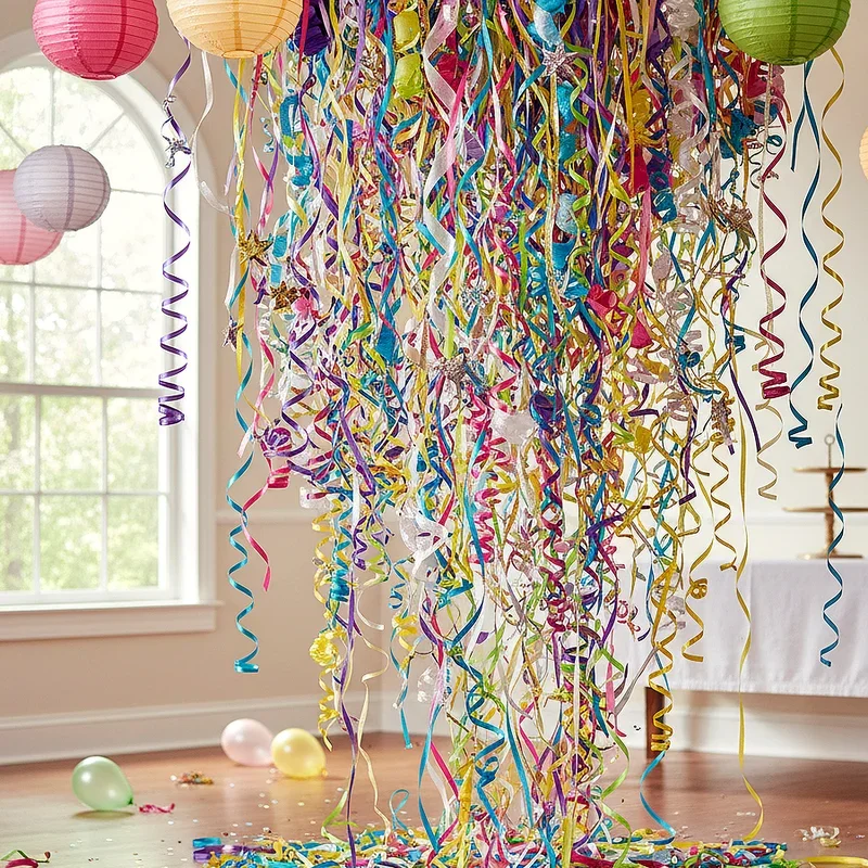 Create dramatic ceiling installations using cascading streamers and ribbons that add movement and color to your birthday celebration. Attach streamers to a central point on the ceiling and let them flow outward like a circus tent for a playful effect. Mix different widths of ribbons and streamers, incorporating metallic options that catch and reflect light beautifully throughout the room. You can create doorway curtains, wall waterfalls, or backdrop designs using this versatile and budget-friendly decoration technique. Twist multiple colors together for a candy cane effect or keep them separate for clean lines and defined colors. This decoration method works particularly well in rooms with high ceilings where the streamers can flow dramatically. Add paper decorations or small balloons along the streamer lengths for extra visual interest and dimension.