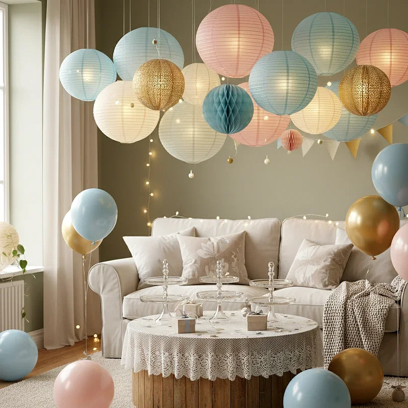 Paper lanterns add an instant festive touch while providing soft, ambient lighting to your birthday celebration space. Hang lanterns at different heights using fishing line or ribbon to create a dynamic, three-dimensional display overhead. Mix various sizes from small to extra-large lanterns for visual interest and depth in your arrangement. Choose colors that complement your party theme or go with classic white for an elegant, timeless look. You can find battery-operated LED inserts to illuminate the lanterns from within, creating a warm glow throughout the room. Position clusters of lanterns over key areas like the gift table, food station, or dance floor to define different party zones. These lightweight decorations are easy to install and remove, making them perfect for temporary party setups.