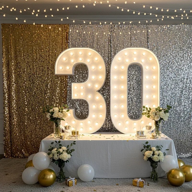 Make age milestones impossible to ignore with illuminated LED number displays that become stunning focal points in your decoration scheme. Rent or purchase large marquee-style numbers that light up, creating a professional event atmosphere in your celebration space. Position these numbers prominently near the entrance, behind the main table, or as part of your photo booth setup. You can find options in various styles from vintage marquee lights to modern LED designs that change colors. Surround the numbers with coordinating balloons, flowers, or greenery to integrate them seamlessly into your overall design. These statement pieces work especially well for significant birthdays like sweet sixteen, twenty-one, or fifty. The illumination adds drama to evening celebrations and creates beautiful lighting effects in photos throughout the party.