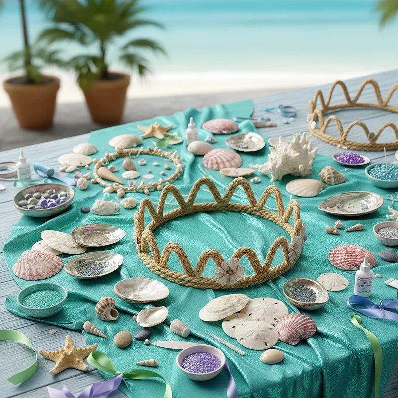 Set up a creative station where party guests can design their own seashell crowns fit for ocean royalty. Provide foam crowns as bases and offer an array of shells, pearls, sequins, and gems for decoration. Include hot glue guns with adult supervision or craft glue for younger children to safely attach their chosen treasures. Display sample crowns to inspire creativity while encouraging each child to express their unique style. This activity doubles as entertainment and creates personalized party favors that guests proudly wear throughout the celebration. The crafting process becomes a social experience where kids bond over their creations, sharing ideas and helping each other bring their underwater visions to life while developing fine motor skills.