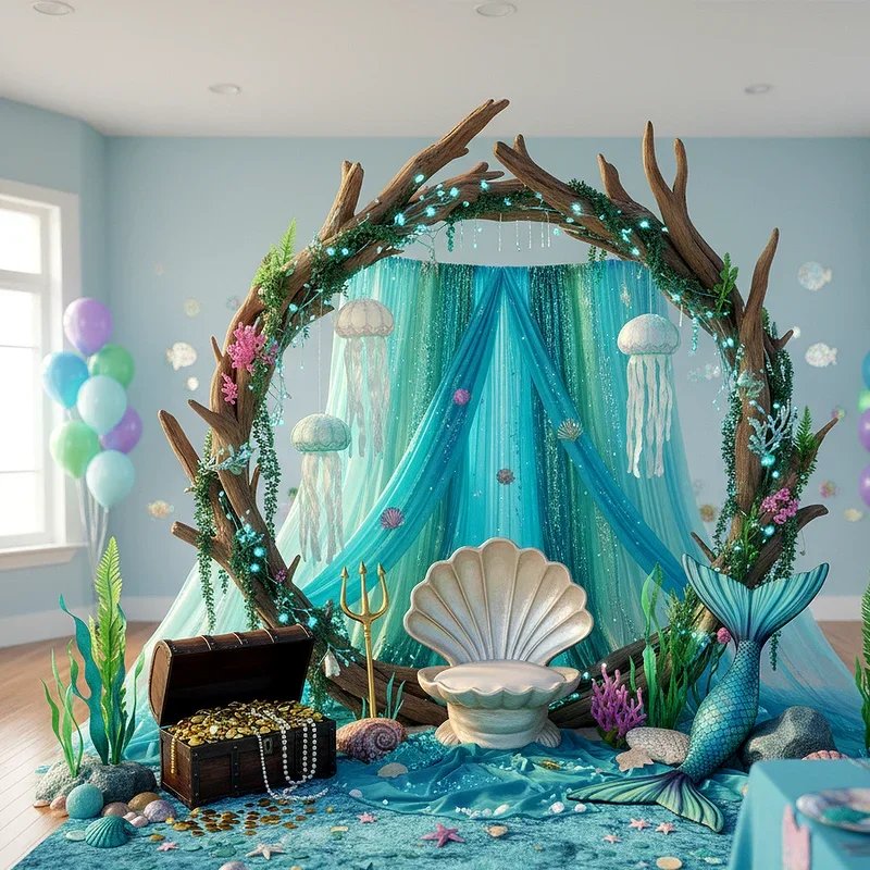 Transform your party entrance into an oceanic portal that instantly transports guests beneath the waves. Hang strips of blue and turquoise streamers from the doorway, creating a curtain effect that mimics flowing water. Add some inflatable sea creatures and paper fish suspended at various heights to create depth and movement. Position a welcome sign shaped like a ship's wheel or treasure map announcing the birthday child's special day. The key is layering different shades of blue, green, and purple materials to achieve that authentic underwater feel. Your guests will feel like they're diving through the ocean's surface into a magical realm where mermaids play and adventure awaits at every coral corner.