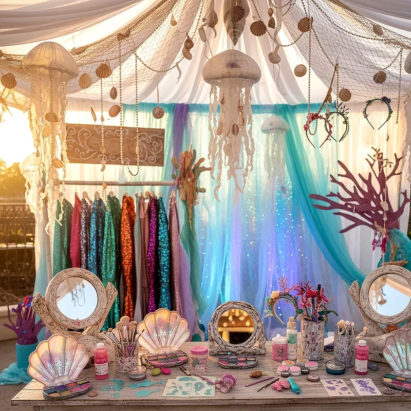 Establish a glamorous makeover station where guests transform into mystical sea creatures with temporary tattoos, face paint, and hair accessories. Offer shimmer spray, colored hair chalk, and clip-in extensions in ocean hues for instant mermaid hair magic. Provide face painting options featuring scales, starfish, and ocean waves using skin-safe glitter and paint. Set up mirrors decorated with seashells so children can admire their transformations as they happen. Include temporary tattoos of sea creatures and mermaid designs for those preferring quicker applications. This station allows creativity to flow freely while giving each child the chance to embody their inner mermaid, building confidence and encouraging imaginative play throughout the party celebration.