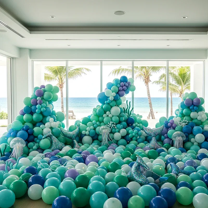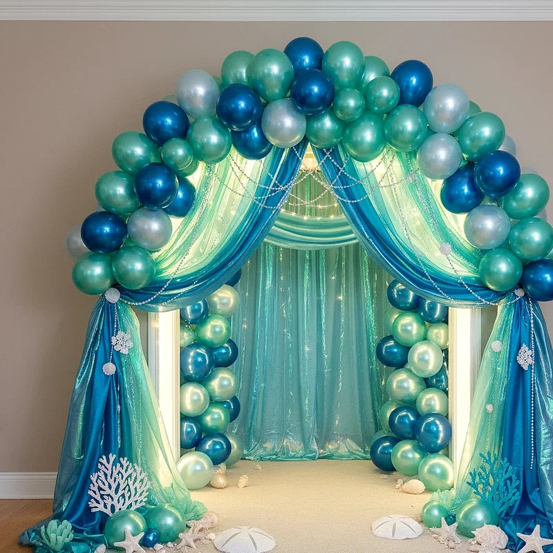 Create an impressive ocean floor scene using clusters of balloons in varying shades of blue, teal, and pearl white. Mix regular balloons with metallic ones to mimic the way sunlight filters through water, creating stunning visual effects. Attach fishing line to helium balloons and secure small paper sea creatures, creating the illusion of floating marine life. Place balloon bouquets at different heights around the room to establish depth and dimension in your underwater world. Add some clear balloons filled with confetti or small plastic fish for an extra special touch that captures attention. This installation becomes the perfect backdrop for photos and sets an immersive atmosphere that makes guests feel they've truly descended into a mermaid's domain.
