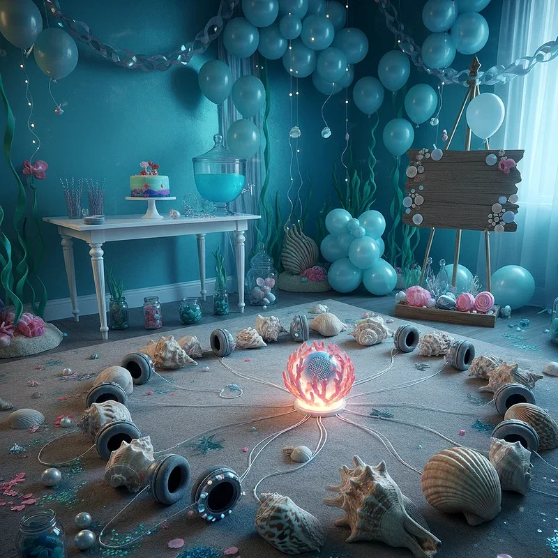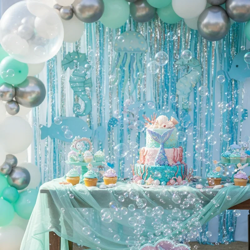 Deploy bubble machines strategically around your party space to create a magical underwater atmosphere with floating bubbles resembling air pockets. Position machines at different heights and angles ensuring bubbles flow throughout the entire area without overwhelming guests. Use bubble solution mixed with a tiny amount of glycerin to create longer-lasting bubbles that shimmer beautifully. Coordinate bubble releases with special moments like cake cutting or present opening for dramatic effect. The continuous stream of bubbles adds movement and whimsy to your underwater theme while delighting children who chase and pop them. This simple addition transforms any space into an enchanted ocean environment where mermaids might appear any moment, swimming through the sparkling bubble currents.