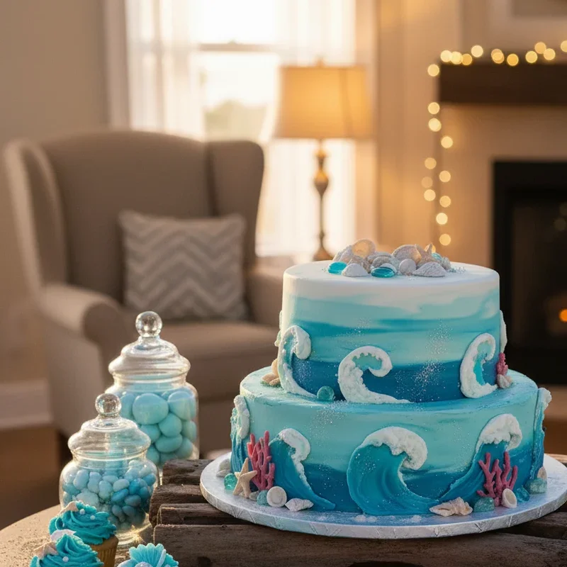 Design a show-stopping cake that captures the essence of ocean waves using buttercream techniques and edible decorations. Create ombre frosting effects transitioning from deep blue to seafoam green, mimicking ocean depths and shallow waters. Add edible pearls, sugar seashells, and fondant sea creatures to bring your underwater scene to life deliciously. Consider incorporating rock candy as coral or using graham cracker crumbs mixed with brown sugar for sandy beach elements. Position a mermaid cake topper at the peak, making her the star of this edible seascape masterpiece. Your cake becomes the centerpiece that ties the entire theme together, creating an Instagram-worthy moment when presented while satisfying sweet teeth with both visual appeal and delicious flavors.