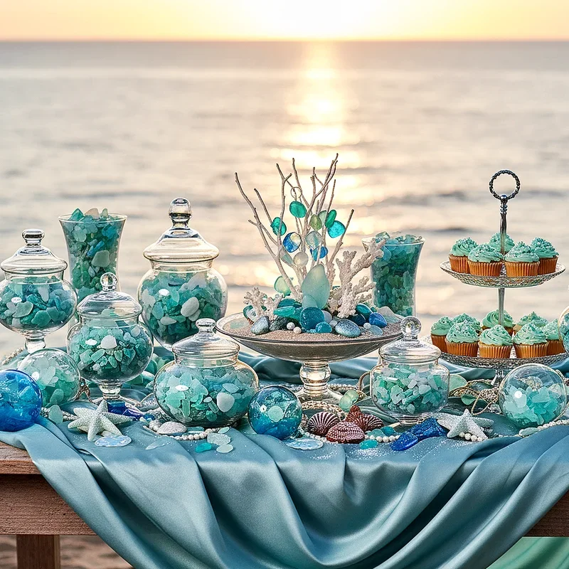 Design an stunning candy bar featuring treats in ocean colors displayed in glass containers resembling collected sea glass treasures. Select candies in blues, greens, and pearlescent whites such as rock candy, gummy fish, and chocolate pearls. Arrange treats at varying heights using cake stands and decorated boxes creating visual interest and easy access. Label each candy type with creative ocean-themed names like "Poseidon's Pearls" or "Mermaid Kisses" adding personality to your display. Provide small bags or boxes decorated with seashell stickers for guests to create their own candy mix combinations. This sweet station becomes both decoration and dessert, offering guests delicious treats while maintaining the cohesive underwater theme throughout your magical celebration.