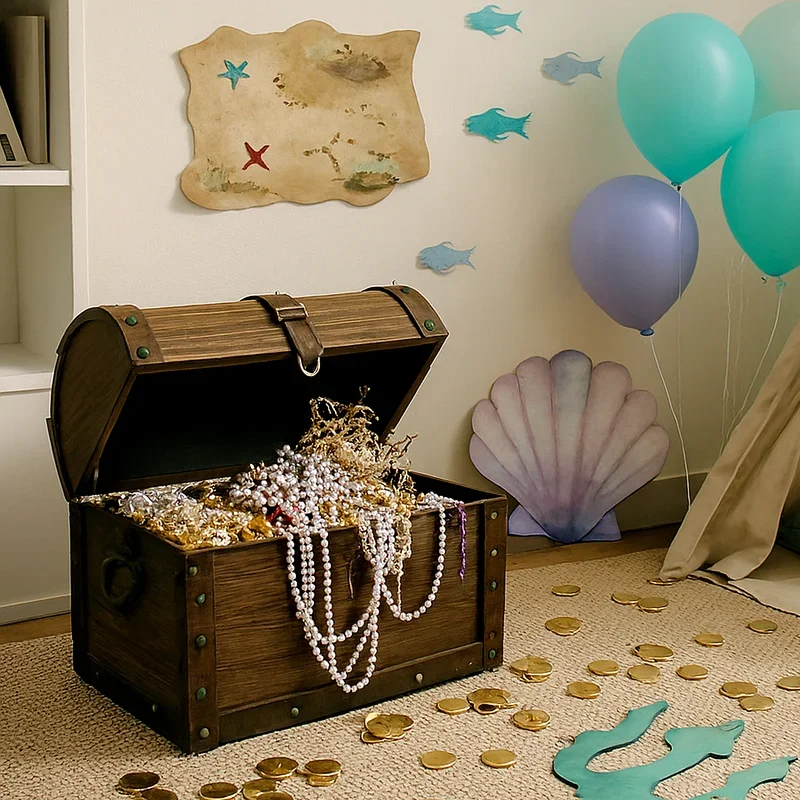 Organize an exciting treasure hunt that sends young adventurers searching for hidden underwater treasures throughout your party space. Create clues written on aged paper and rolled into message bottles, leading participants from one location to another. Hide treasures like chocolate coins, small toys, and costume jewelry in creative spots decorated as underwater landmarks. Design a map showing different areas as ocean zones like Coral Reef Corner or Shark Bay to add adventure. Make the final treasure a chest filled with party favors ensuring everyone wins something special. This activity combines problem-solving with physical movement, keeping energy levels high while children work together deciphering clues and discovering hidden prizes that make them feel like true ocean explorers.