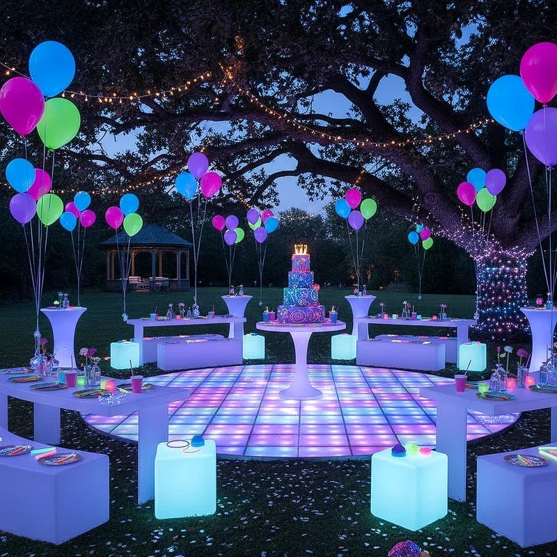 Transform your backyard into a neon wonderland after sunset with black lights, glow sticks, and fluorescent decorations everywhere you look. Set up a dance floor area with UV reactive tape patterns and provide glow accessories like bracelets, necklaces, and face paint. Create a playlist of high energy dance music and consider hiring a DJ or setting up a karaoke station for entertainment. Serve glowing drinks using tonic water under black light and decorate cupcakes with neon frosting that pops under UV lighting. Install black lights strategically around the yard and hang glow in the dark stars and shapes from trees and structures. This party theme creates an otherworldly atmosphere that teenagers and young adults absolutely love for birthday celebrations. The combination of music, movement, and glowing visuals makes for incredible photos and memories that last forever.