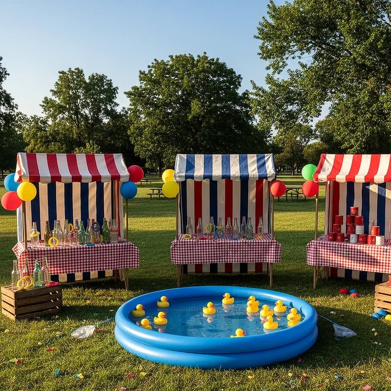 Bring the excitement of a carnival midway to your park party with DIY game stations that'll keep guests entertained for hours! Set up ring toss, bean bag throw, duck pond fishing, and a prize wheel using simple materials and colorful decorations. Create tickets from cardstock that kids earn at each station, later exchanging them for prizes at your "redemption booth" stocked with small toys and treats. Add carnival music playing from a portable speaker and consider renting a cotton candy or popcorn machine for authentic fair food. Each game should be easy enough for younger kids but challenging enough to keep older ones interested. This theme brings all the fun of a carnival without the crowds or expense, giving everyone multiple chances to win.