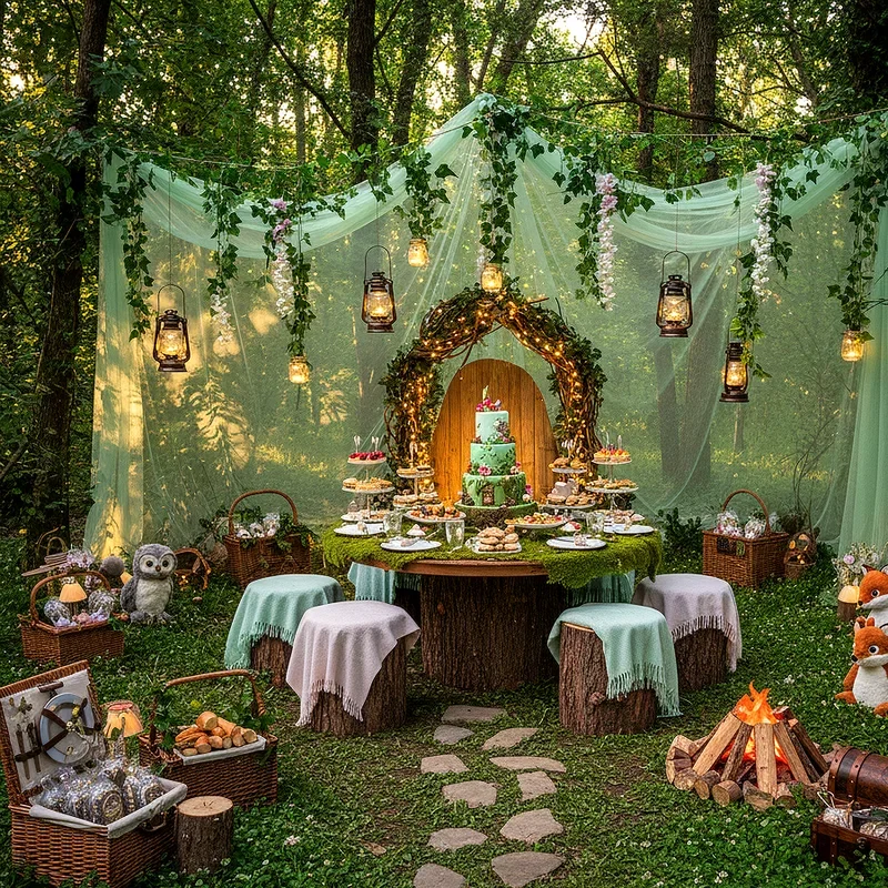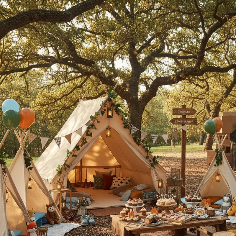 Bring the camping experience to your daytime park party with tents, campfire stories, and outdoor survival games that spark adventure! Set up small pop-up tents as activity stations, teach basic knot-tying skills, and organize nature identification games. Create a fake campfire using logs arranged in a circle with battery-operated lights or tissue paper flames for storytelling time. Serve traditional camping foods like hot dogs, trail mix, and of course, materials for making s'mores using portable camping stoves or solar ovens. Include camping-themed games like flashlight tag, compass navigation challenges, and sleeping bag races. This theme gives kids a taste of outdoor adventure while staying close to home, perfect for those who love nature but aren't quite ready for overnight camping.