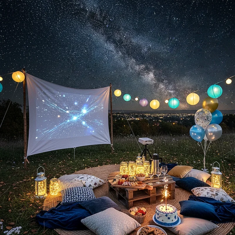 Transform your backyard into an outdoor cinema with a projector, white sheet screen, and cozy seating arrangements of blankets, pillows, and lawn chairs. Create individual snack boxes filled with movie theater favorites like popcorn, candy, and nachos so guests can munch without missing any action on screen. String lights overhead provide just enough illumination for safe movement while maintaining that authentic theater darkness perfect for film viewing. Choose a birthday themed movie or let the guest of honor pick their all time favorite to share with everyone under the twinkling stars above. This relaxed celebration style appeals to all ages and provides built in entertainment that lets guests unwind while still feeling part of something special and memorable.