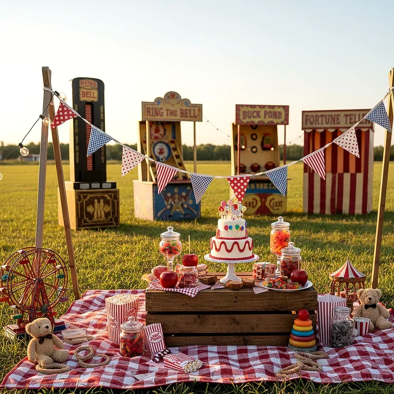 Bring the excitement of old fashioned fairgrounds to your outdoor space with striped tents, colorful bunting, and classic carnival games like ring toss and duck pond. Rent or create game booths where guests win tickets they can exchange for prizes at your birthday prize counter filled with nostalgic treats. Serve carnival favorites from a decorated food station featuring popcorn machines, cotton candy makers, and hot dog rollers that fill the air with irresistible aromas. Add authenticity with vintage circus posters, hay bales for seating, and a playlist of classic carousel music that transports everyone back to simpler times. This theme guarantees non stop entertainment while allowing guests to mingle freely between games, creating natural conversation starters and shared experiences throughout your special day.