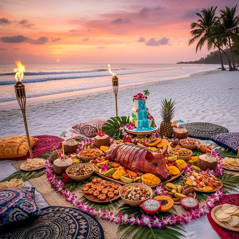 Transport your guests to a Hawaiian paradise with tiki torches, colorful leis for everyone, and tropical decorations featuring palm fronds and hibiscus flowers everywhere. Set up a DIY fruit bar where guests can create their own tropical bowls with exotic fruits like dragon fruit, starfruit, and passion fruit. Organize traditional luau games like limbo contests and hula hoop competitions that get everyone moving to island inspired music playing in the background. Serve Hawaiian favorites like kalua pork sliders, poke bowls, and grilled pineapple that bring authentic island flavors to your outdoor celebration. The festive atmosphere encourages guests to embrace the aloha spirit, creating a relaxed and joyful environment where everyone feels like they're on a mini vacation together.