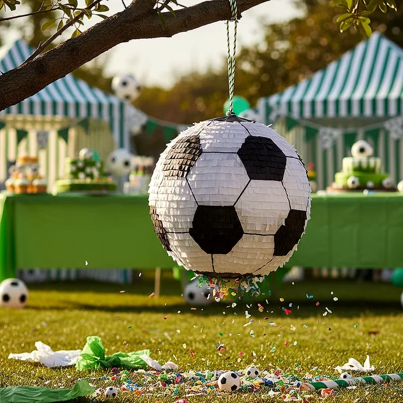 Nothing says party quite like a piñata, and a soccer ball version perfectly fits your theme! Whether you buy one or make your own using papier-mâché techniques, fill it with soccer-themed goodies like whistles, stickers, trading cards, and wrapped candies. Hang it securely and establish clear safety rules before starting, including a wide circle for spectators. Let the birthday child go first, then organize turns by age to ensure fairness. Use a plastic bat decorated with soccer ball patterns to maintain your theme even in the small details. The anticipation builds as each child takes their swings, creating an electric atmosphere of excitement. When it finally breaks, the scramble for treats becomes one of the party's most memorable moments. This classic party element never gets old and always delivers pure joy!