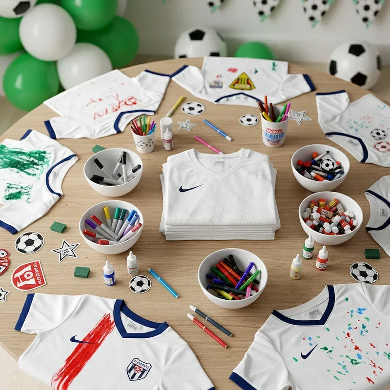 Give guests a creative outlet by letting them design their own team jerseys! Purchase plain white or colored t-shirts in various sizes and set up a decorating station with fabric markers, iron-on letters, and numbers. Provide stencils of soccer balls, stars, and lightning bolts for those who need design inspiration. Let kids choose their player numbers and write their names or nicknames on the back. You can also offer puffy paint, glitter glue, and fabric stickers for extra pizzazz. This activity serves double duty as both entertainment and a party favor guests actually want to keep. Set up a runway show at the end where everyone models their creations. These personalized jerseys become cherished mementos that kids will wear long after the party ends!