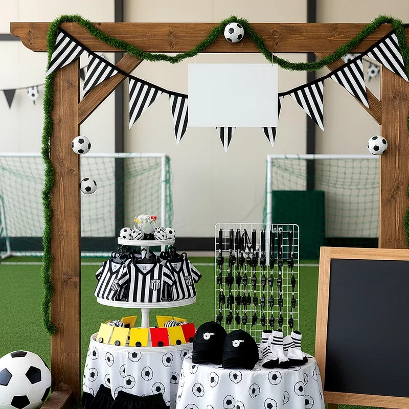 Add hilarious photo opportunities and role-playing fun with a referee dress-up station! Stock it with black and white striped shirts, whistles on lanyards, and official-looking clipboards with fake penalty cards. Let guests take turns being the referee during party games, making dramatic calls and showing cards for silly infractions. Create a list of funny penalties like "excessive celebration" or "illegal use of hands during cake eating" that refs can call throughout the party. This activity adds an extra layer of entertainment to every other game you play. Kids love the authority that comes with the whistle and take their referee duties seriously, which helps with game organization too. The dress-up corner becomes a popular spot for impromptu photoshoots and gives shy kids a fun way to participate!