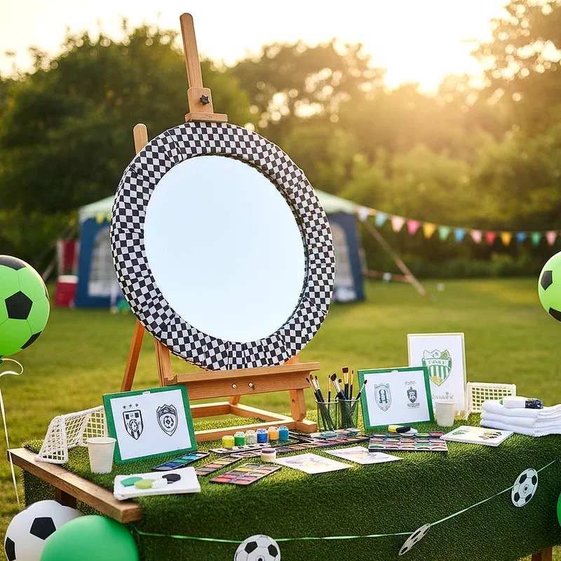 Add color and creativity to your party with a face painting station featuring soccer designs! Set up a table with mirrors, face paints, and picture examples of soccer balls, team flags, and player numbers. You don't need professional skills; simple designs like soccer balls on cheeks or team colors in stripes work perfectly. Provide wet wipes and paper towels for quick cleanups between designs. If you're not confident painting freehand, use stencils or temporary tattoos as alternatives that still give that decorated look. Kids love choosing their designs and showing them off in photos. This activity works great during arrival time as guests trickle in or as a calmer alternative between high-energy games. The painted faces add to your party's visual appeal!