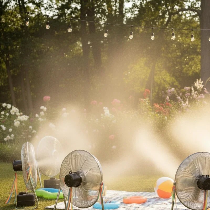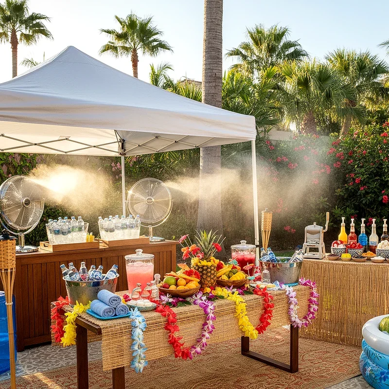 Combine the cooling power of misting fans with heart-pumping dance music for a party that keeps guests moving without overheating. Set up multiple industrial misting fans around your dance floor area, whether it's your backyard, garage, or rented pavilion space. Create different temperature zones where guests can choose their comfort level, from light mist to full spray stations for those who really want to cool down. Hire a DJ or create playlists that match the tropical vibe with reggae, calypso, and summer hits that get everyone grooving. Add LED lights and glow sticks for evening parties, creating a club atmosphere where the mist creates magical light effects. This setup works especially well for teen and adult birthdays where dancing is a main attraction but summer heat usually limits outdoor dance parties.
